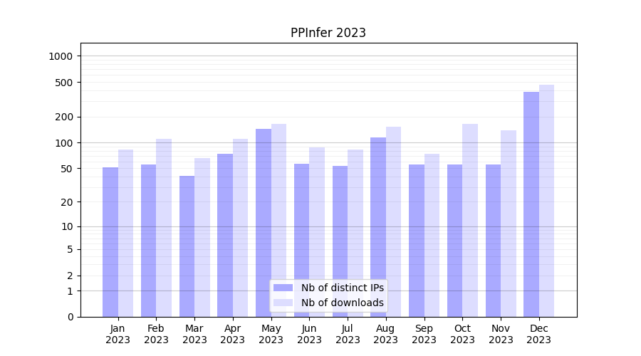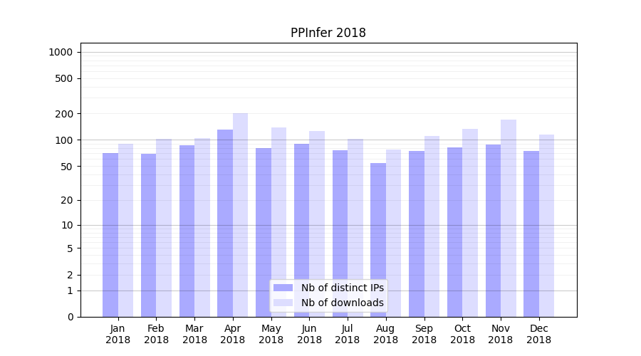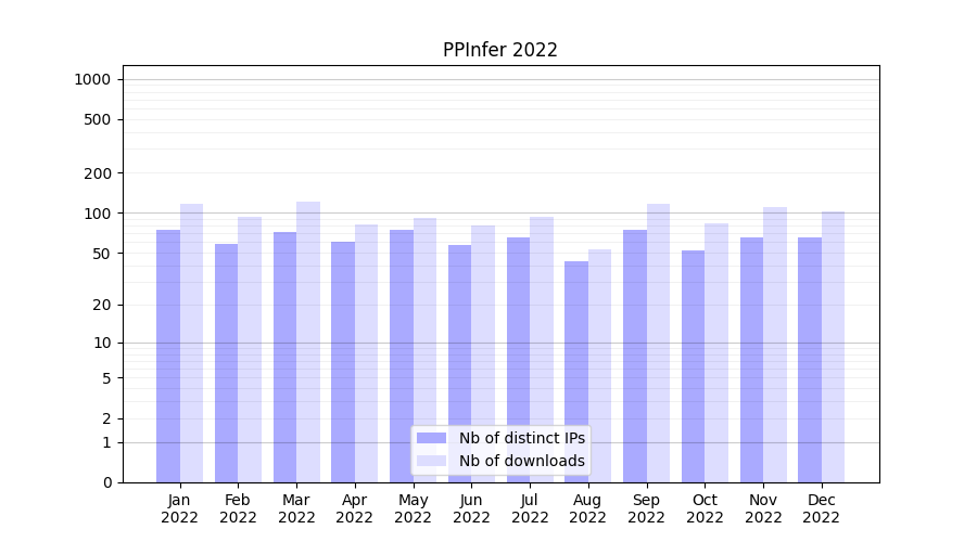 Number of downloads for software package PPInfer, year by year, from 2025 back to 2014 (years with no downloads are omitted):