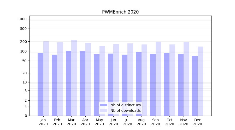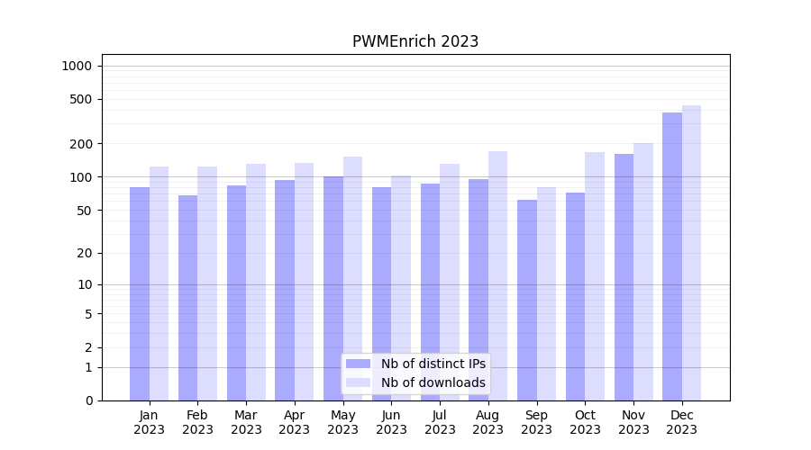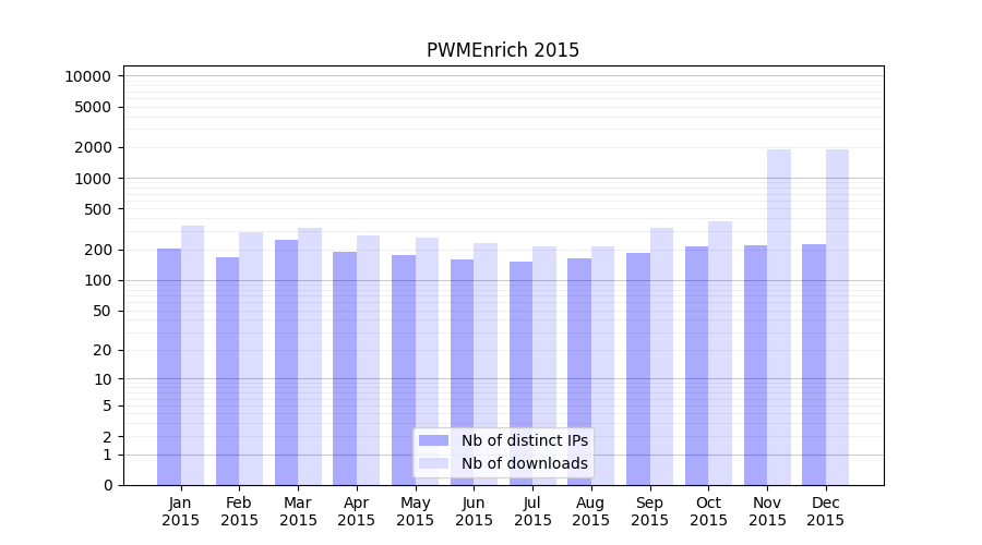 Number of downloads for software package PWMEnrich, year by year, from 2025 back to 2014 (years with no downloads are omitted):