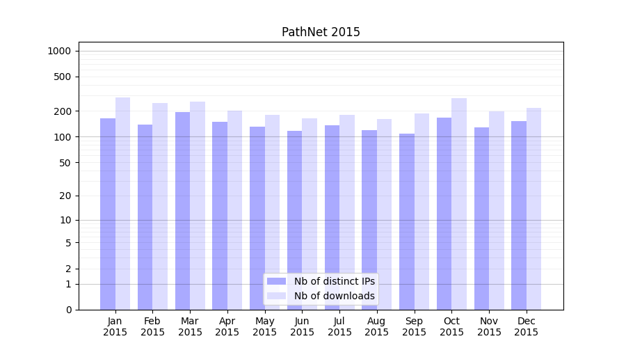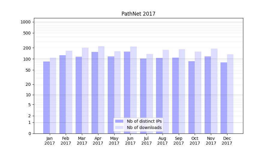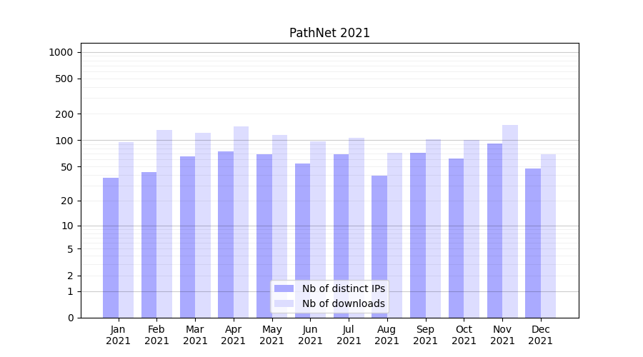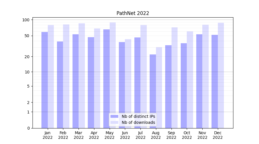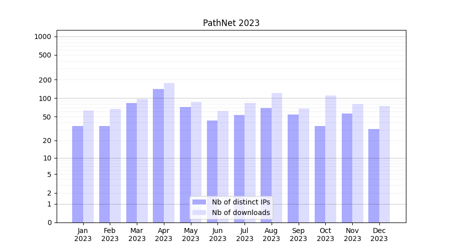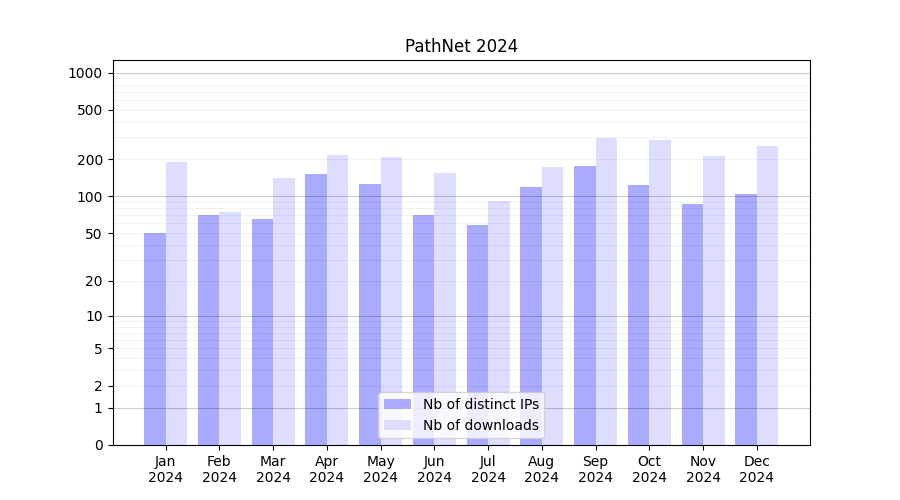 Number of downloads for software package PathNet, year by year, from 2025 back to 2014 (years with no downloads are omitted):