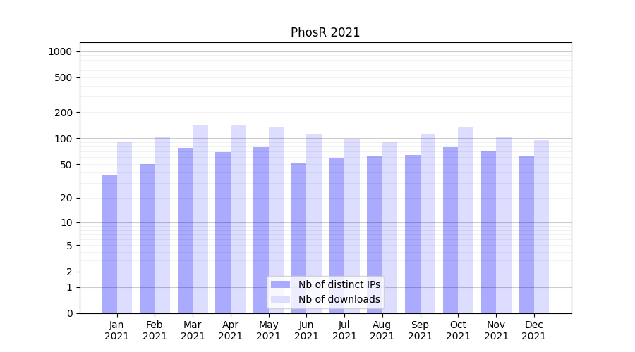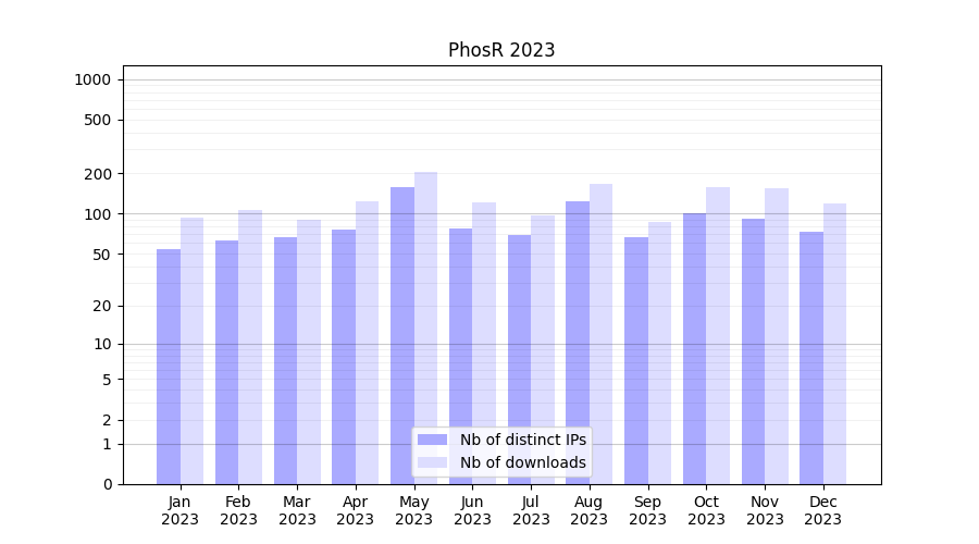 Number of downloads for software package PhosR, year by year, from 2025 back to 2014 (years with no downloads are omitted):