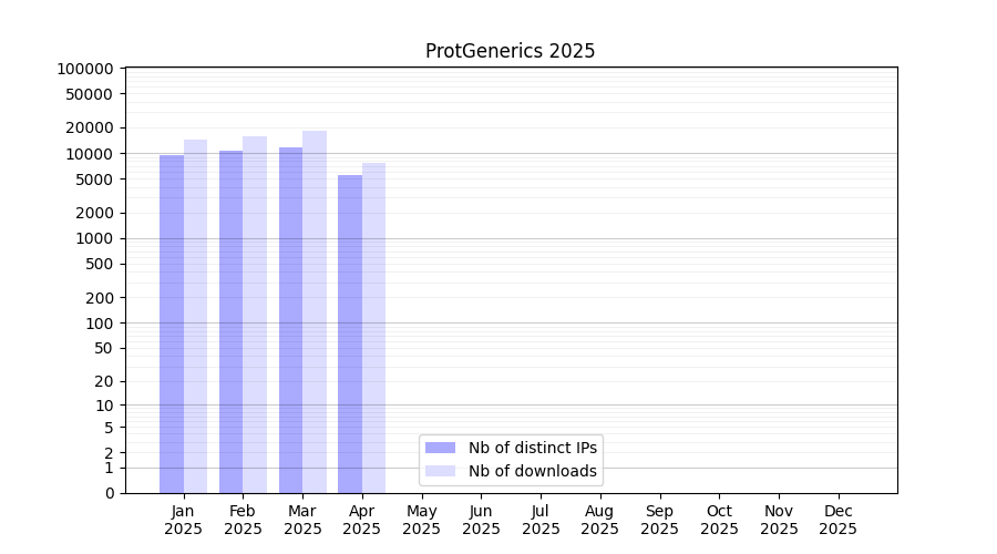 Number of downloads for software package ProtGenerics, year by year, from 2025 back to 2014 (years with no downloads are omitted):