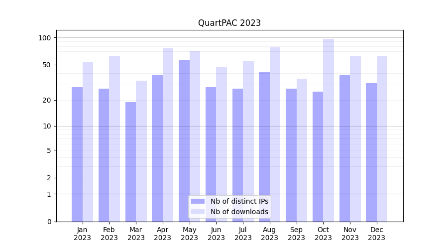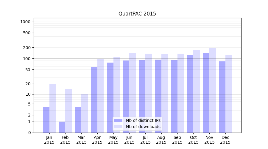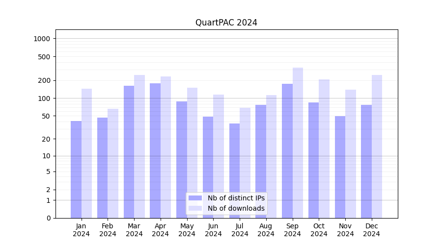 Number of downloads for software package QuartPAC, year by year, from 2025 back to 2014 (years with no downloads are omitted):