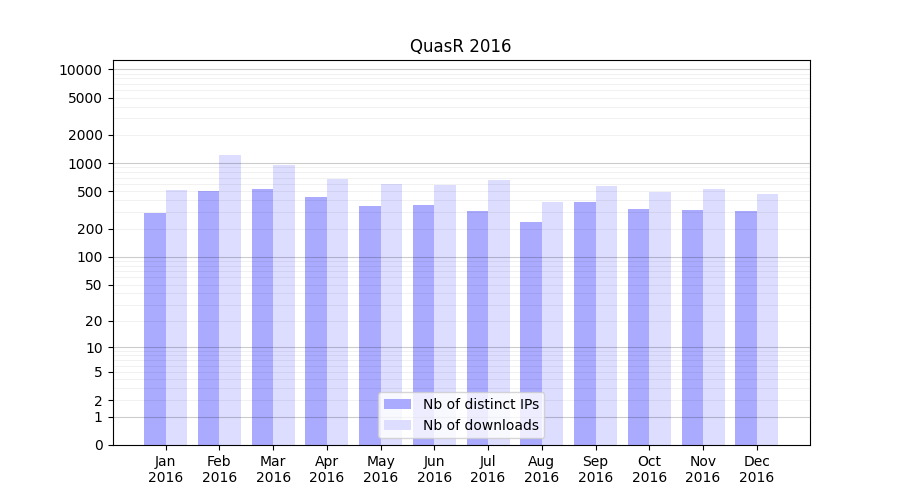 Number of downloads for software package QuasR, year by year, from 2025 back to 2014 (years with no downloads are omitted):