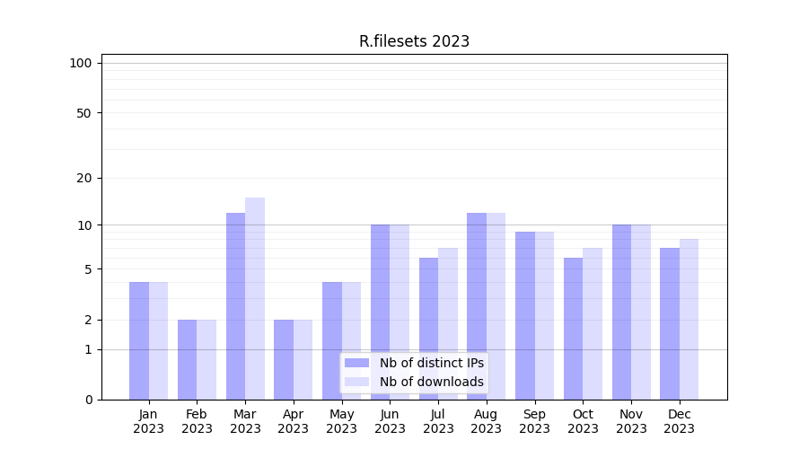 Number of downloads for software package R.filesets, year by year, from 2025 back to 2014 (years with no downloads are omitted):