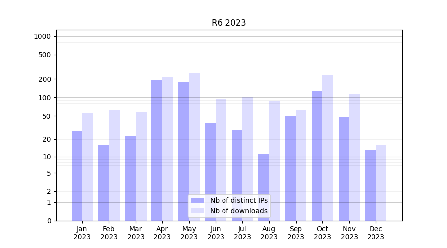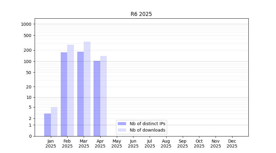 Number of downloads for software package R6, year by year, from 2025 back to 2014 (years with no downloads are omitted):