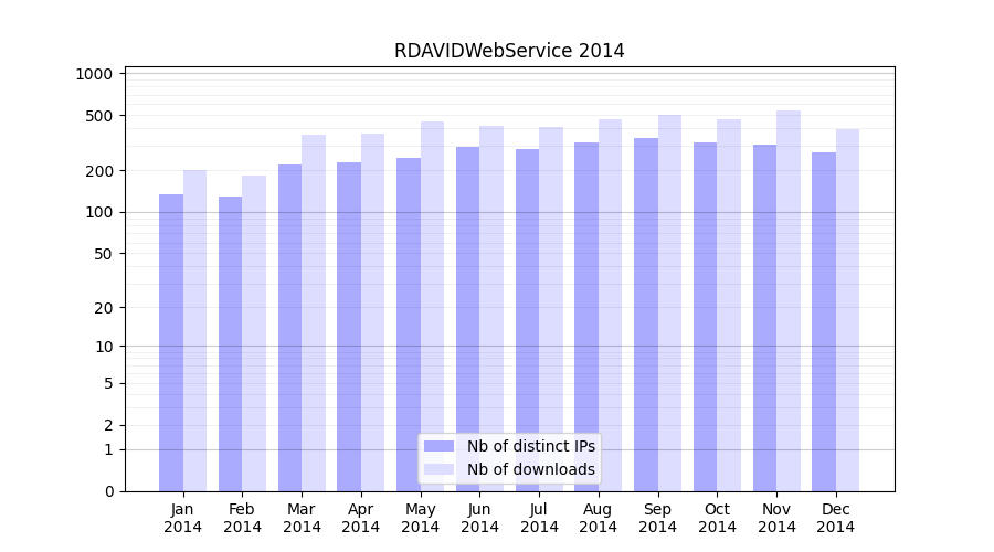 Number of downloads for software package RDAVIDWebService, year by year, from 2025 back to 2014 (years with no downloads are omitted):