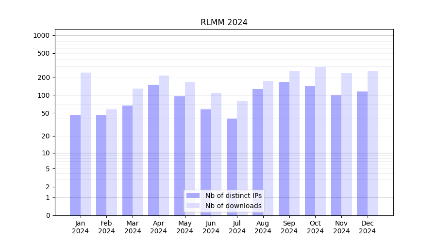 Number of downloads for software package RLMM, year by year, from 2025 back to 2014 (years with no downloads are omitted):