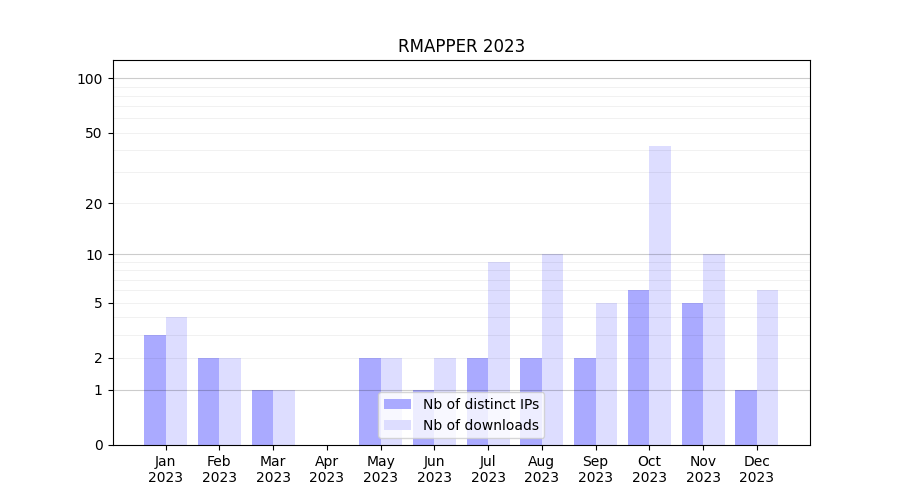 Number of downloads for software package RMAPPER, year by year, from 2025 back to 2014 (years with no downloads are omitted):