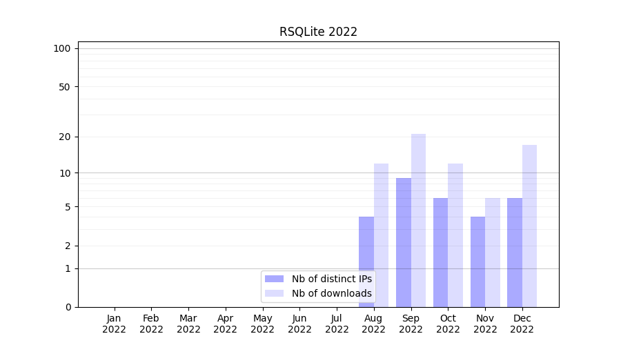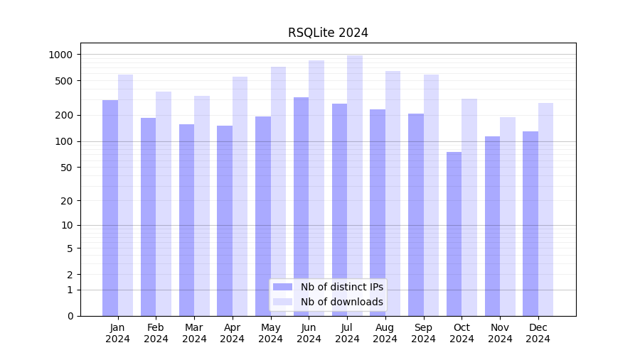 Number of downloads for software package RSQLite, year by year, from 2025 back to 2014 (years with no downloads are omitted):