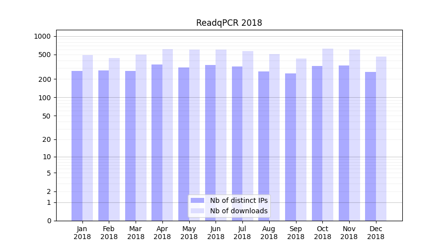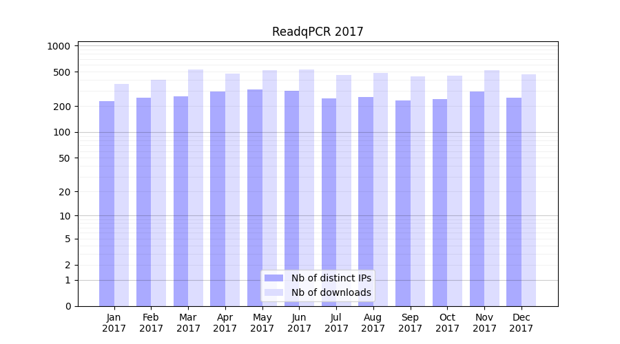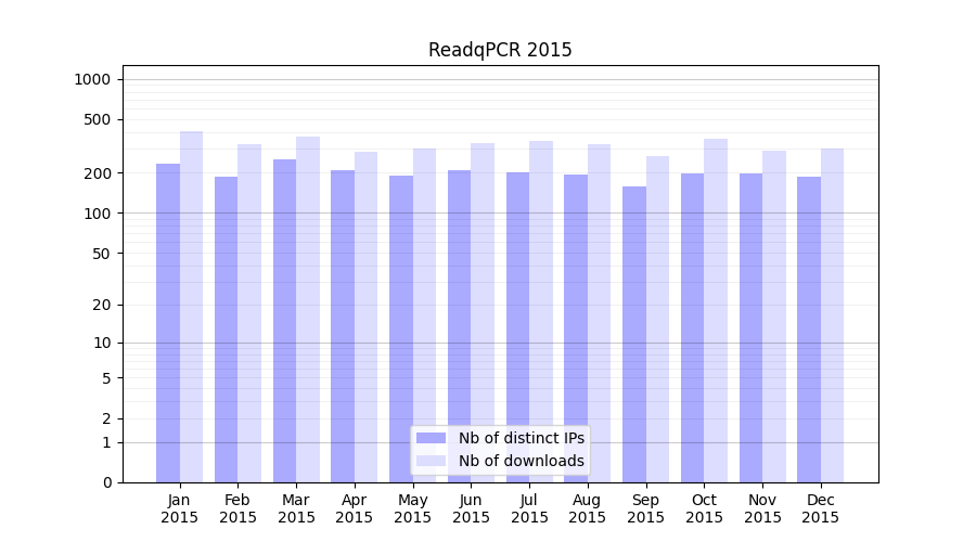 Number of downloads for software package ReadqPCR, year by year, from 2025 back to 2014 (years with no downloads are omitted):