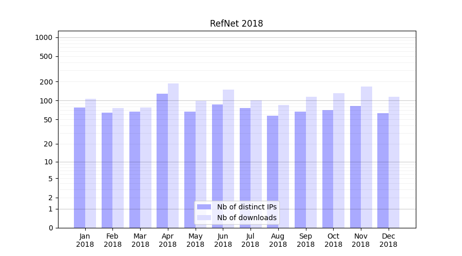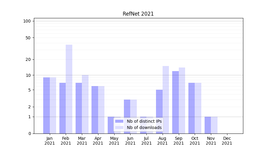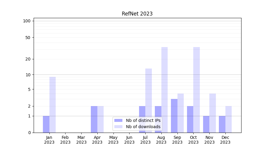 Number of downloads for software package RefNet, year by year, from 2025 back to 2014 (years with no downloads are omitted):