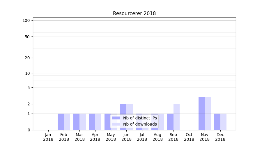 Number of downloads for software package Resourcerer, year by year, from 2025 back to 2014 (years with no downloads are omitted):