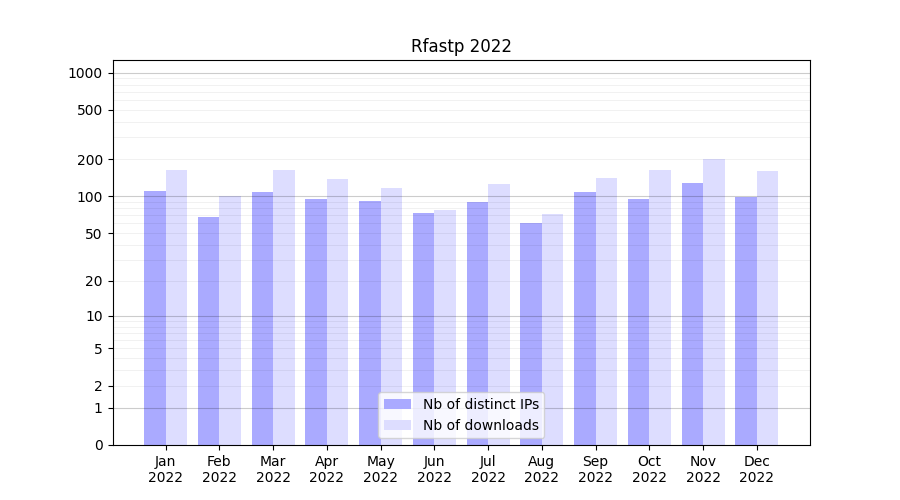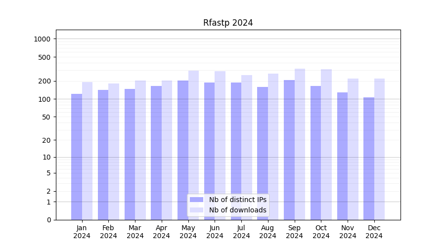 Number of downloads for software package Rfastp, year by year, from 2025 back to 2014 (years with no downloads are omitted):