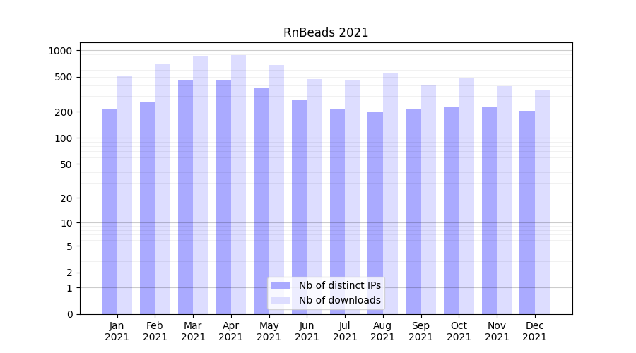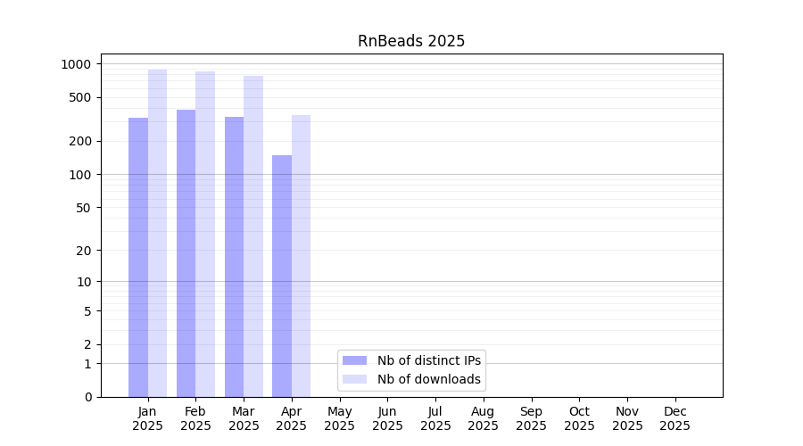 Number of downloads for software package RnBeads, year by year, from 2025 back to 2014 (years with no downloads are omitted):