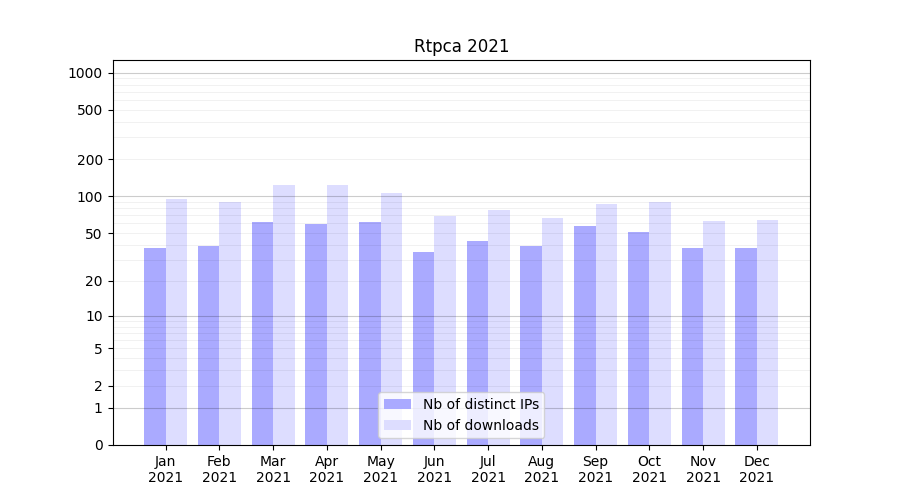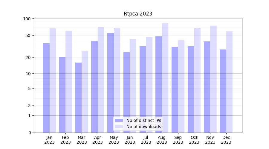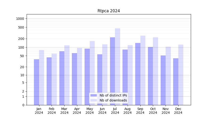 Number of downloads for software package Rtpca, year by year, from 2025 back to 2014 (years with no downloads are omitted):
