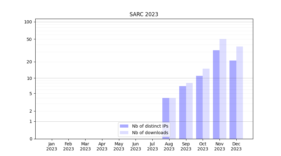 Number of downloads for software package SARC, year by year, from 2025 back to 2014 (years with no downloads are omitted):