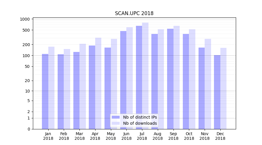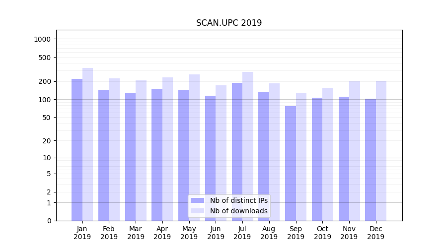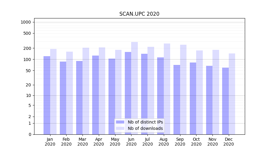 Number of downloads for software package SCAN.UPC, year by year, from 2025 back to 2014 (years with no downloads are omitted):