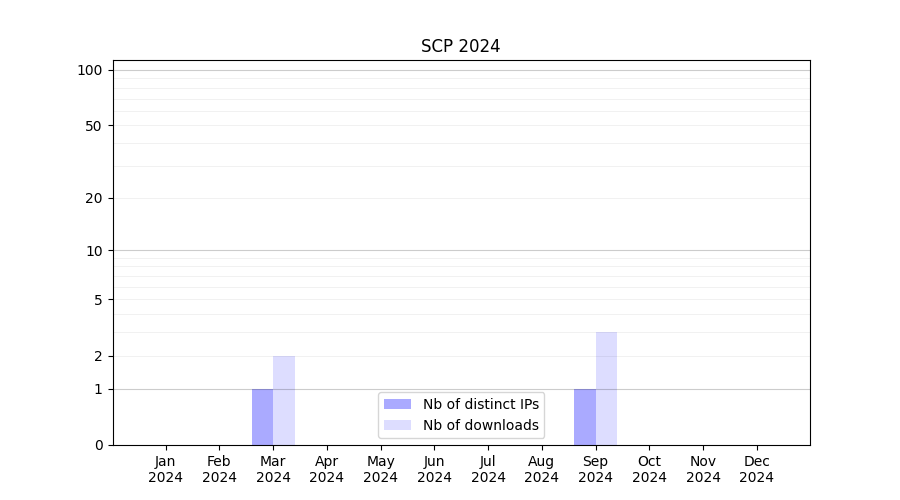 Number of downloads for software package SCP, year by year, from 2025 back to 2014 (years with no downloads are omitted):