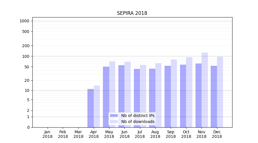 Number of downloads for software package SEPIRA, year by year, from 2025 back to 2014 (years with no downloads are omitted):