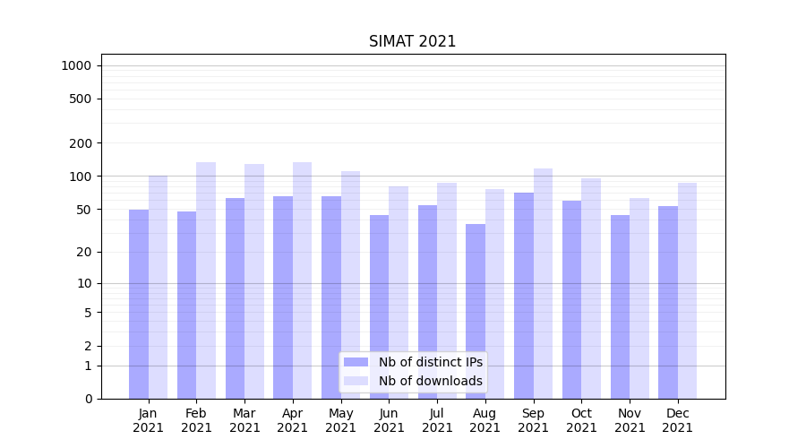 Number of downloads for software package SIMAT, year by year, from 2025 back to 2014 (years with no downloads are omitted):