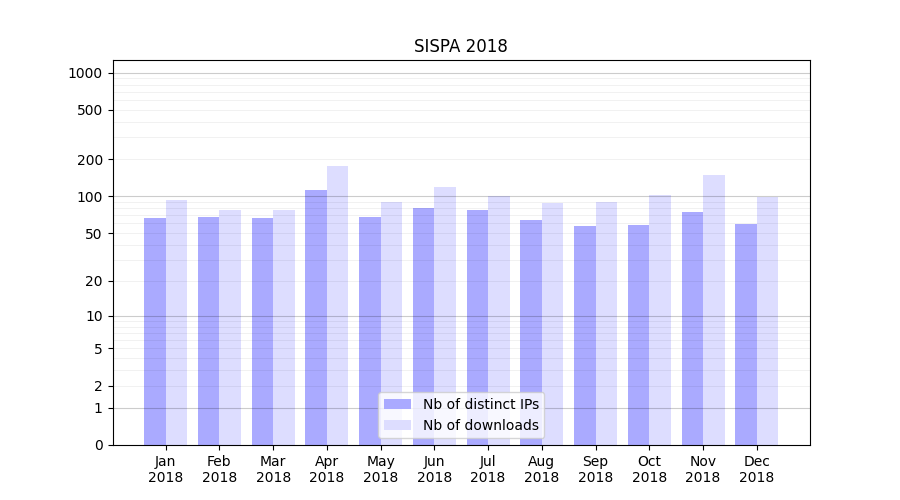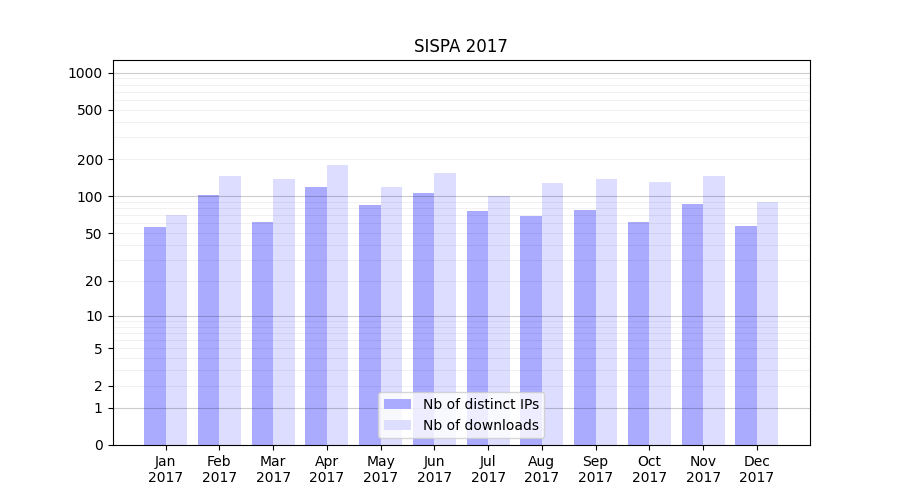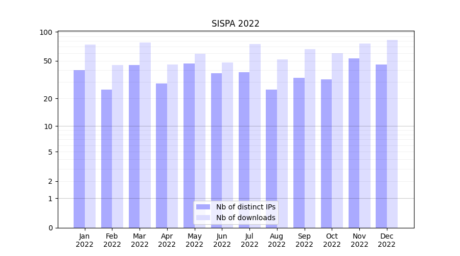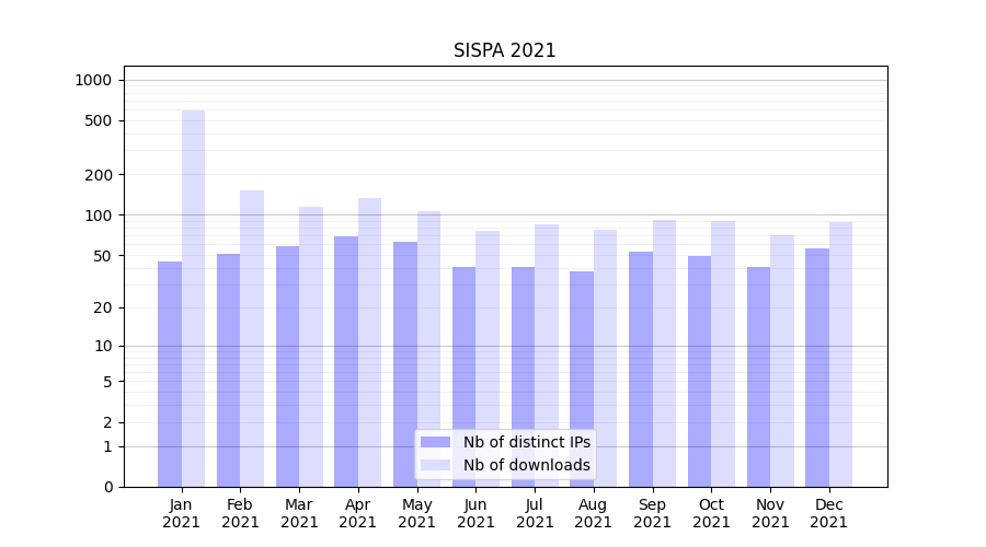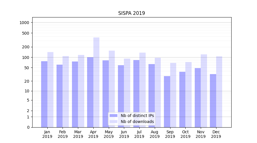 Number of downloads for software package SISPA, year by year, from 2025 back to 2014 (years with no downloads are omitted):