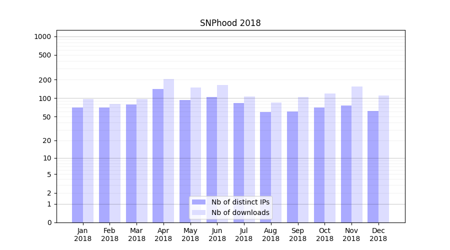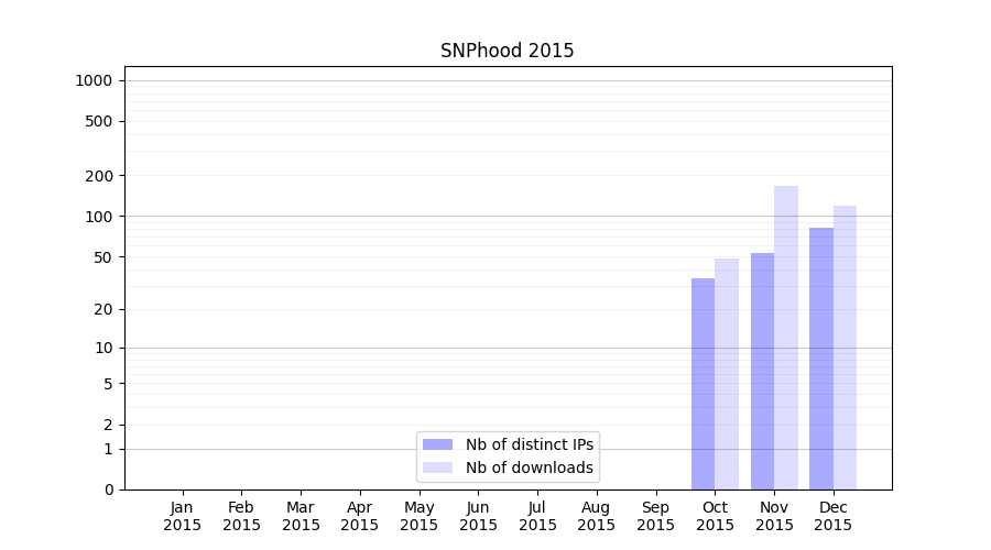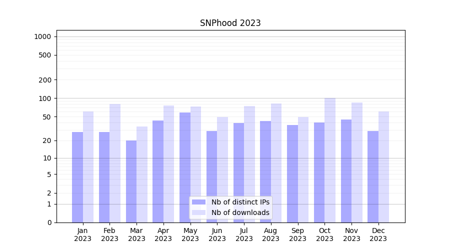 Number of downloads for software package SNPhood, year by year, from 2025 back to 2014 (years with no downloads are omitted):