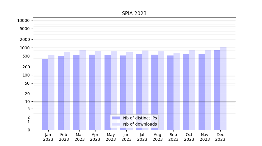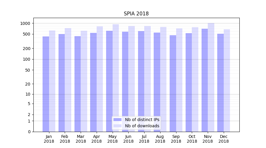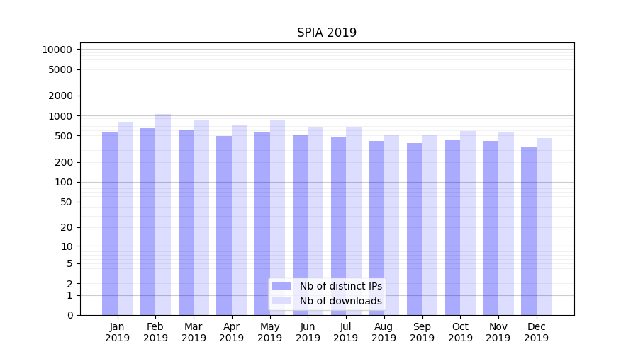 Number of downloads for software package SPIA, year by year, from 2025 back to 2014 (years with no downloads are omitted):