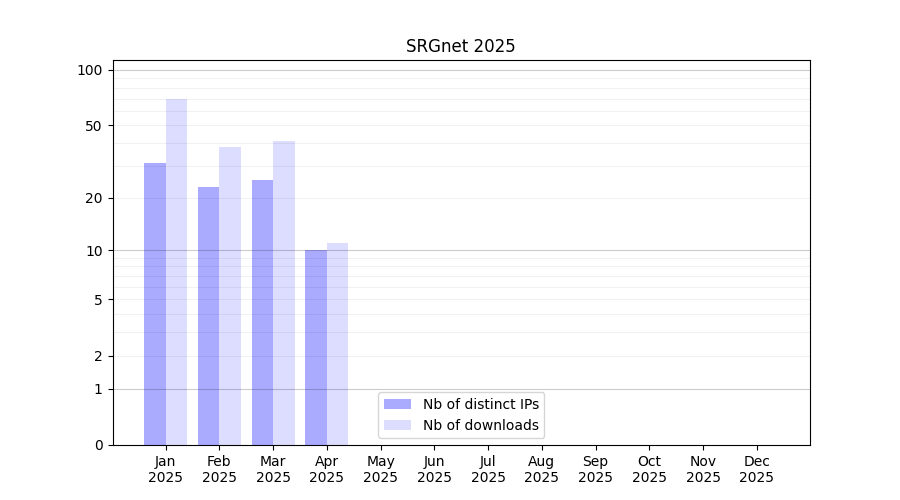 Number of downloads for software package SRGnet, year by year, from 2025 back to 2014 (years with no downloads are omitted):