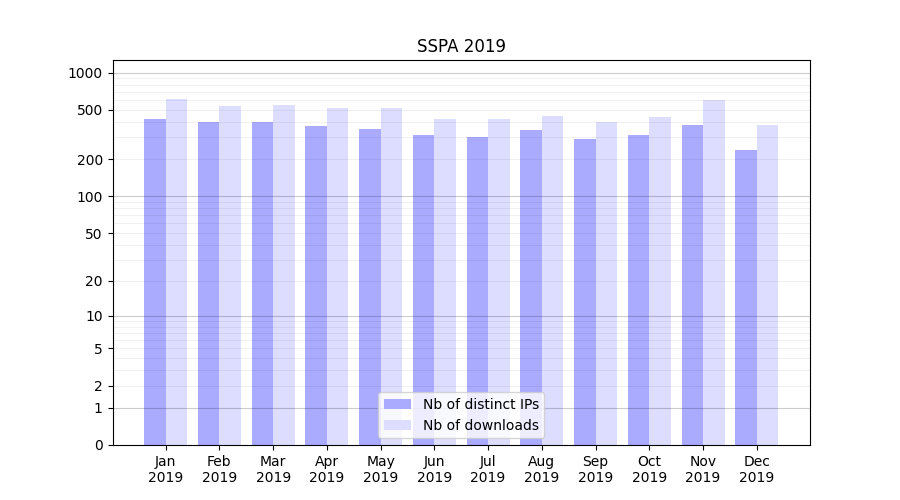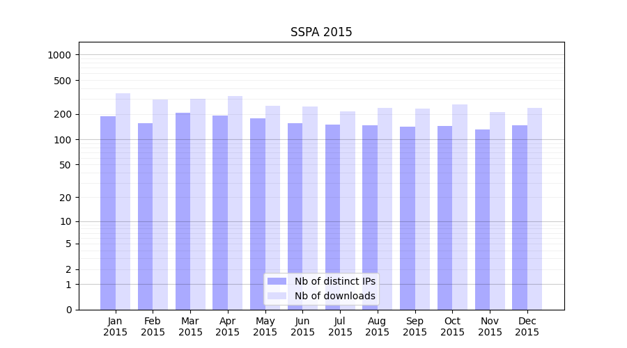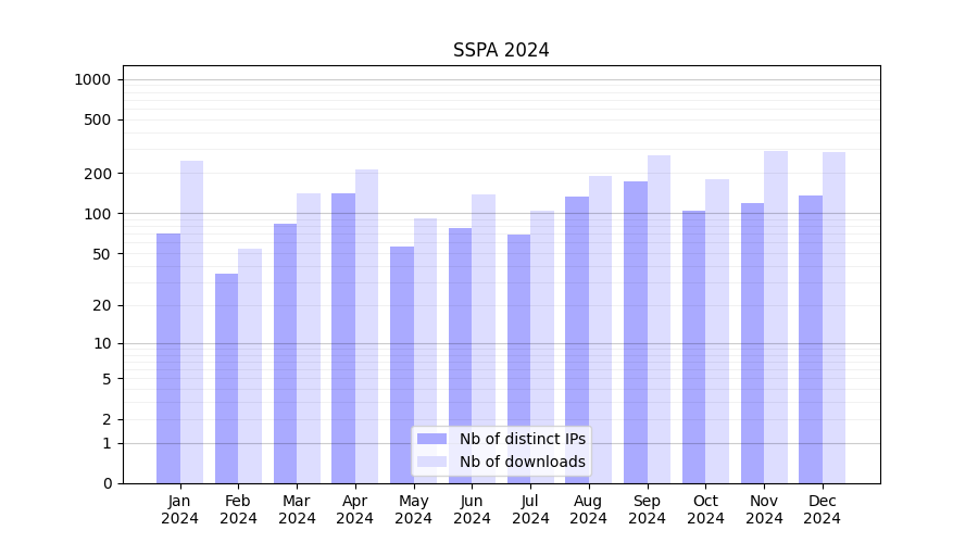 Number of downloads for software package SSPA, year by year, from 2025 back to 2014 (years with no downloads are omitted):