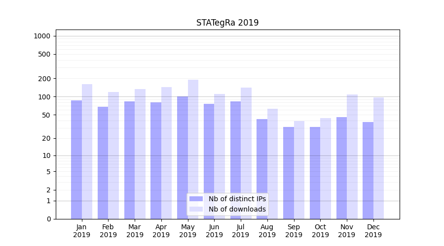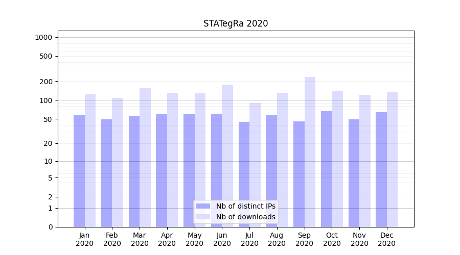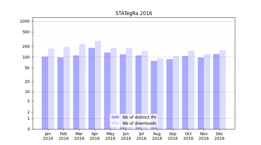 Number of downloads for software package STATegRa, year by year, from 2025 back to 2014 (years with no downloads are omitted):