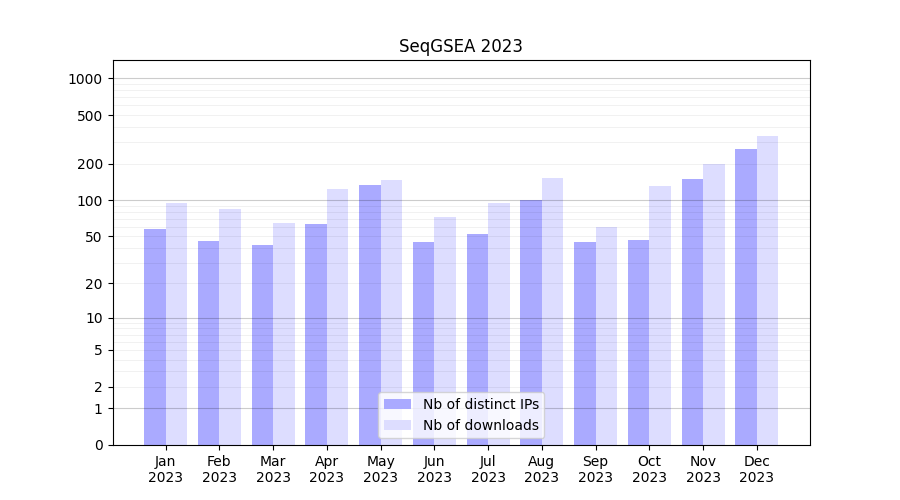 Number of downloads for software package SeqGSEA, year by year, from 2025 back to 2014 (years with no downloads are omitted):