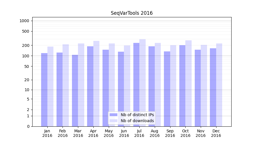 Number of downloads for software package SeqVarTools, year by year, from 2025 back to 2014 (years with no downloads are omitted):