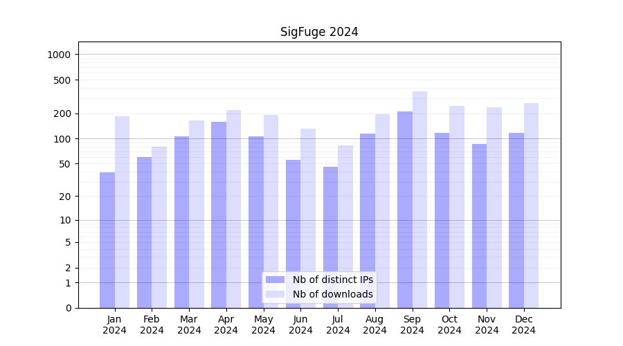 Number of downloads for software package SigFuge, year by year, from 2025 back to 2014 (years with no downloads are omitted):