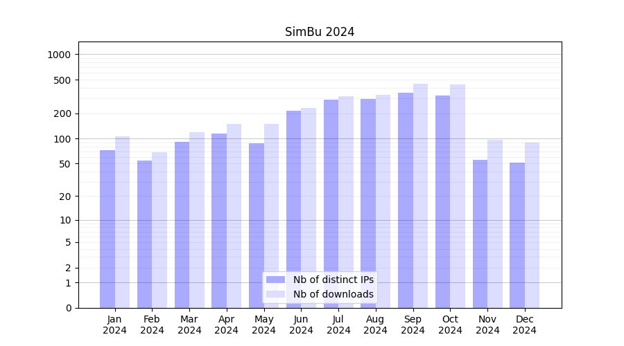 Number of downloads for software package SimBu, year by year, from 2025 back to 2014 (years with no downloads are omitted):