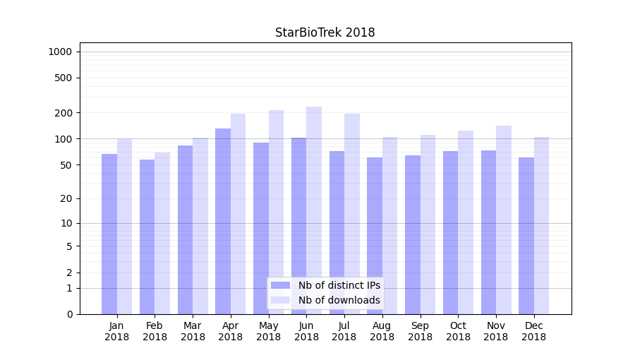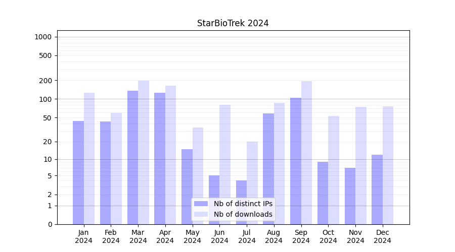 Number of downloads for software package StarBioTrek, year by year, from 2025 back to 2014 (years with no downloads are omitted):