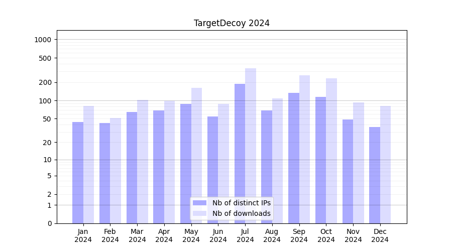 Number of downloads for software package TargetDecoy, year by year, from 2025 back to 2014 (years with no downloads are omitted):