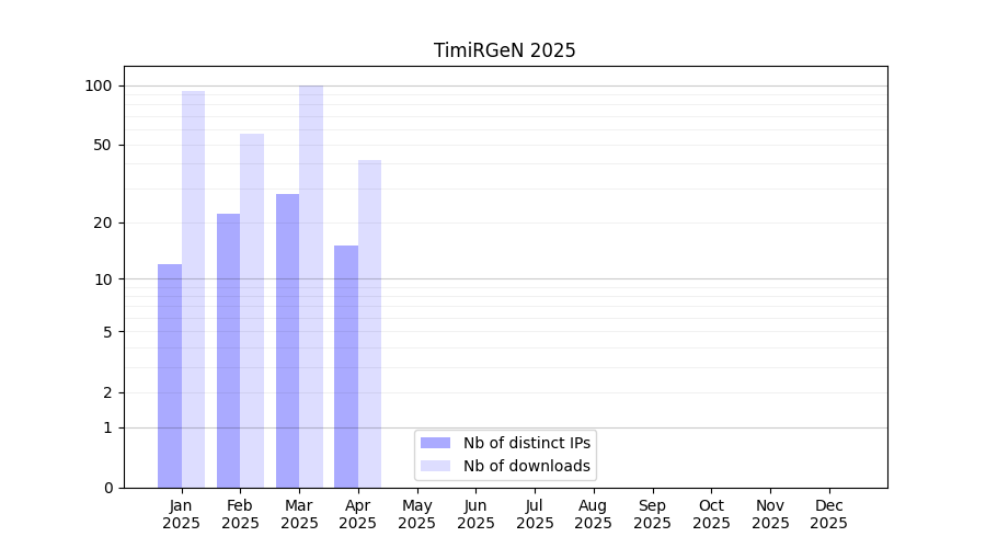 Number of downloads for software package TimiRGeN, year by year, from 2025 back to 2014 (years with no downloads are omitted):