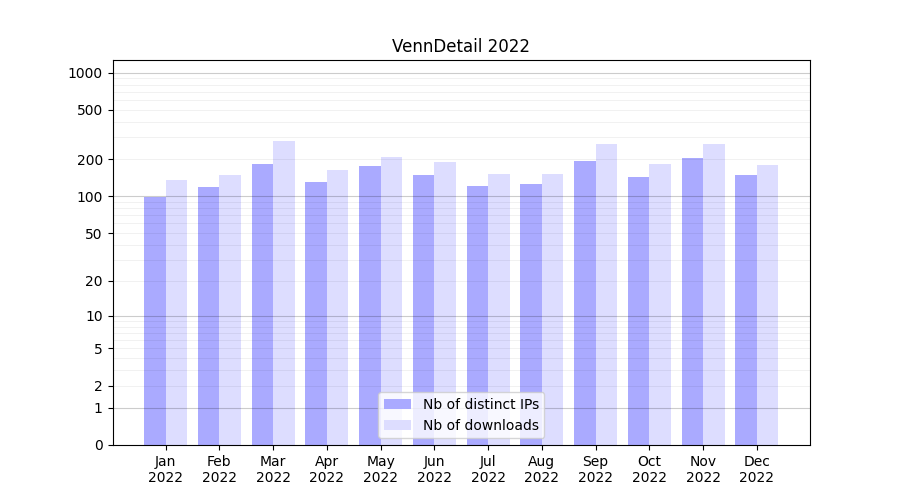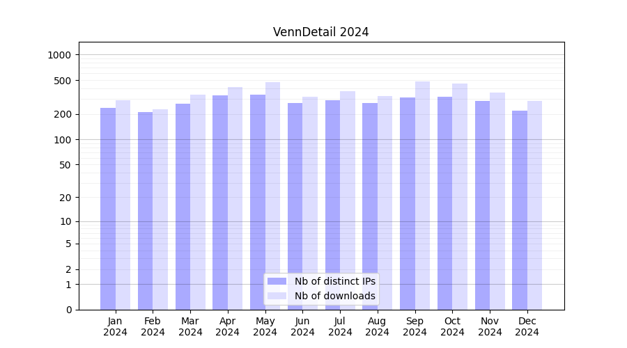 Number of downloads for software package VennDetail, year by year, from 2025 back to 2014 (years with no downloads are omitted):