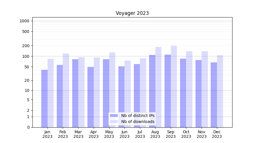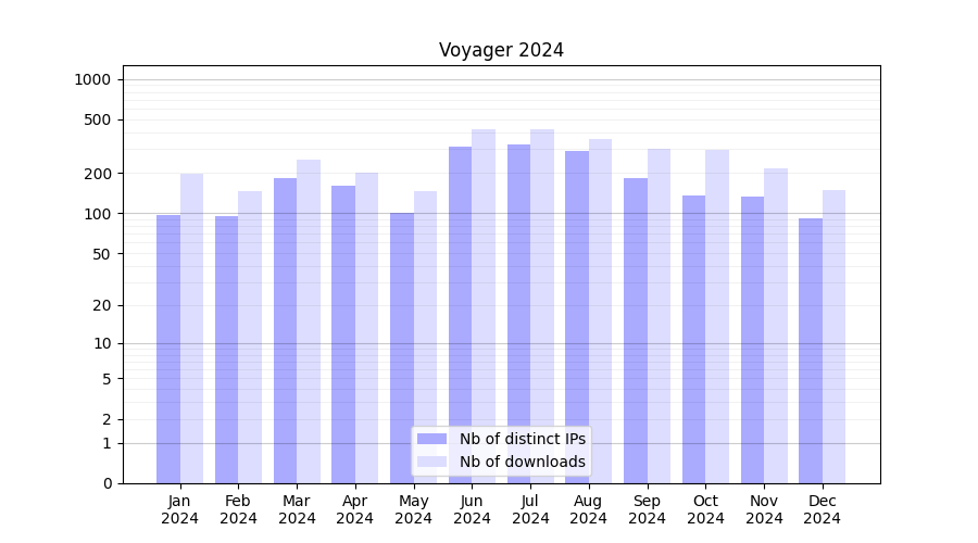 Number of downloads for software package Voyager, year by year, from 2025 back to 2014 (years with no downloads are omitted):