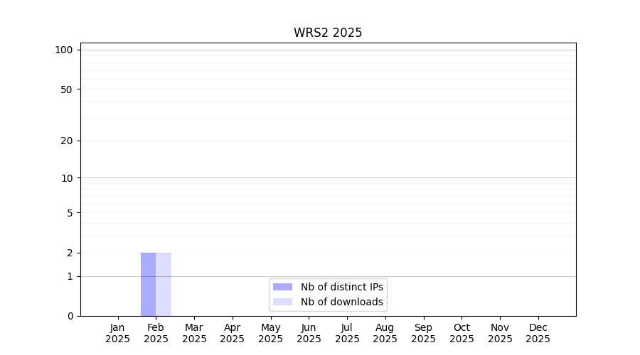 Number of downloads for software package WRS2, year by year, from 2025 back to 2014 (years with no downloads are omitted):