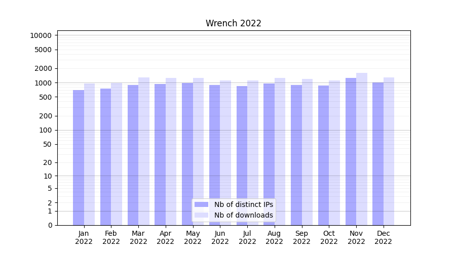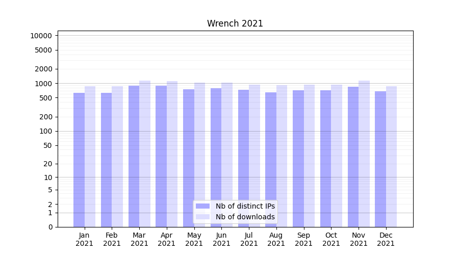 Number of downloads for software package Wrench, year by year, from 2025 back to 2014 (years with no downloads are omitted):