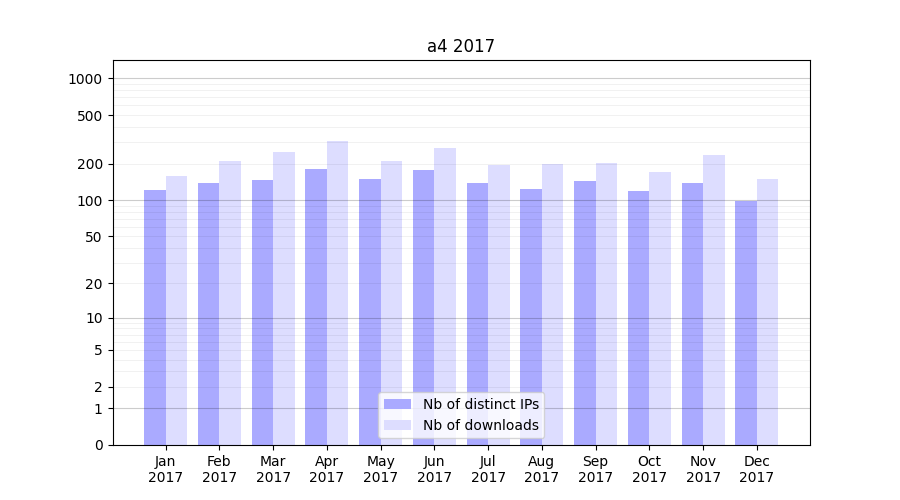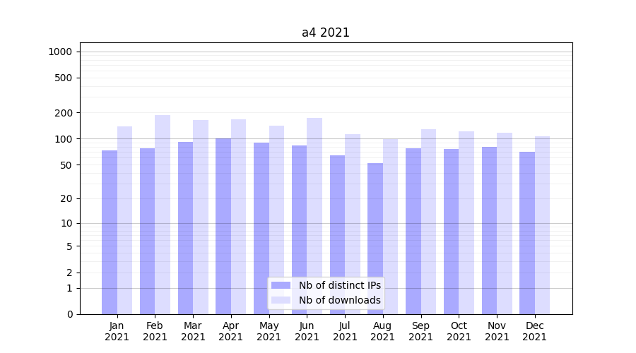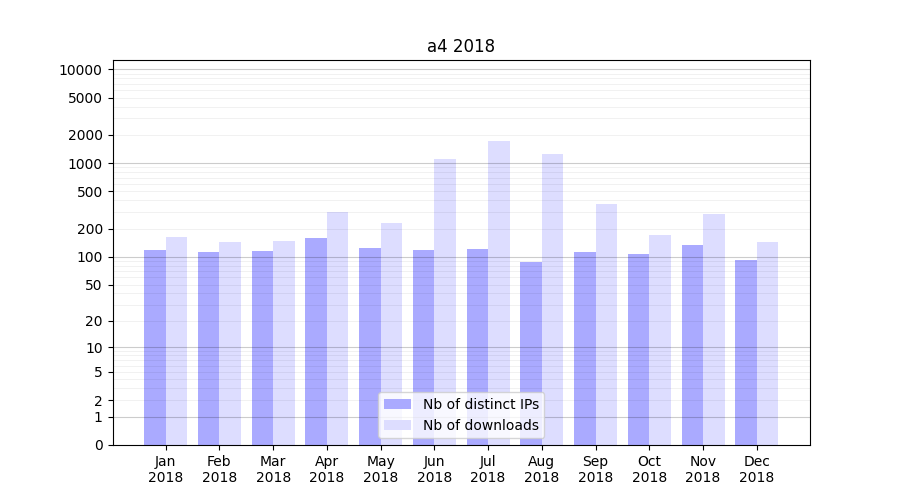 Number of downloads for software package a4, year by year, from 2025 back to 2014 (years with no downloads are omitted):