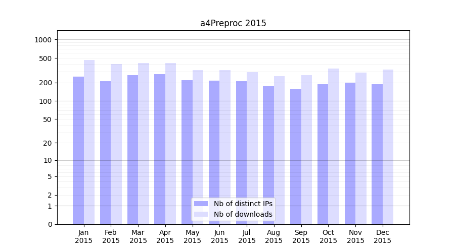 Number of downloads for software package a4Preproc, year by year, from 2025 back to 2014 (years with no downloads are omitted):