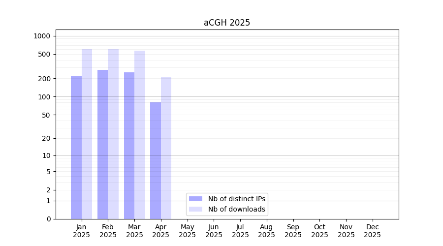Number of downloads for software package aCGH, year by year, from 2025 back to 2014 (years with no downloads are omitted):