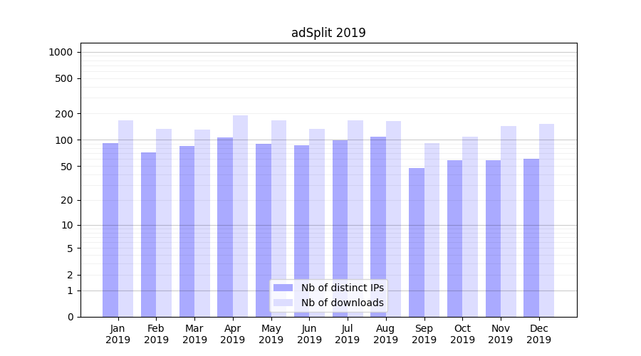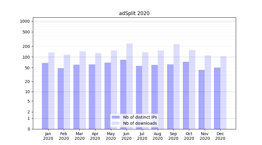 Number of downloads for software package adSplit, year by year, from 2025 back to 2014 (years with no downloads are omitted):