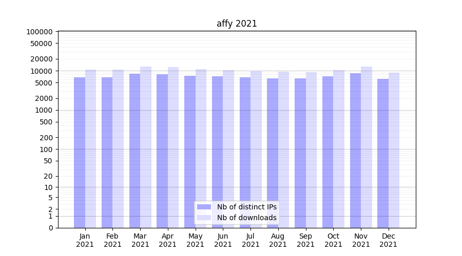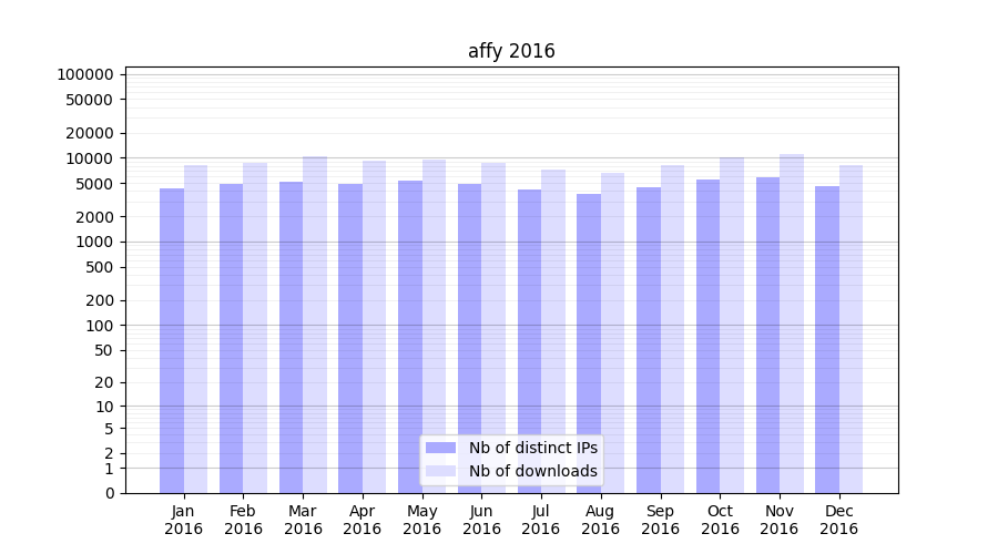 Number of downloads for software package affy, year by year, from 2025 back to 2014 (years with no downloads are omitted):