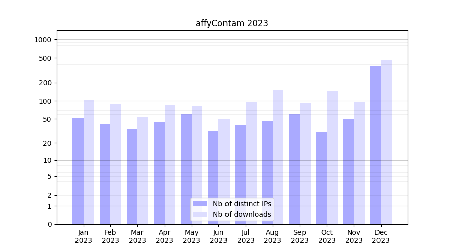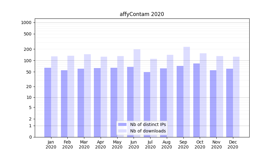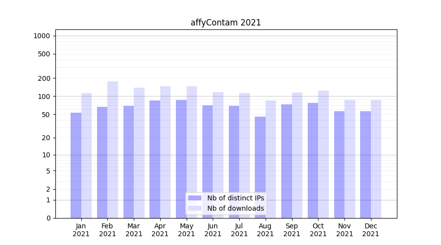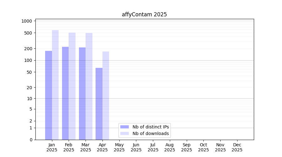 Number of downloads for software package affyContam, year by year, from 2025 back to 2014 (years with no downloads are omitted):