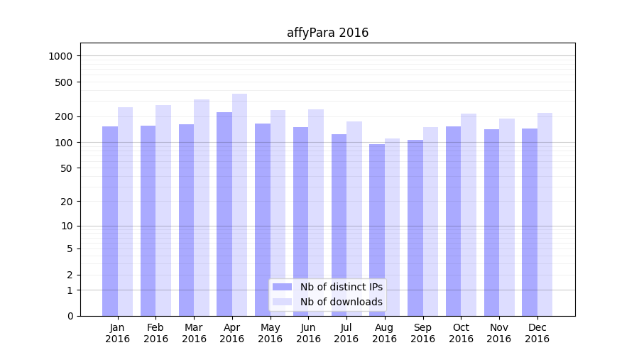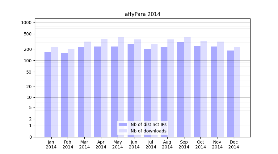 Number of downloads for software package affyPara, year by year, from 2025 back to 2014 (years with no downloads are omitted):