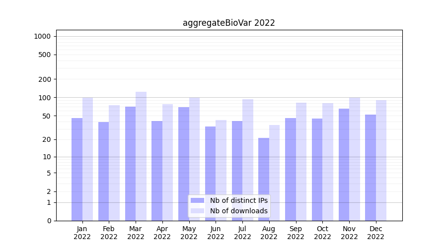 Number of downloads for software package aggregateBioVar, year by year, from 2025 back to 2014 (years with no downloads are omitted):
