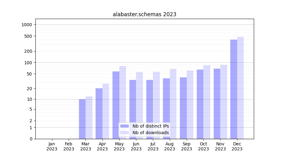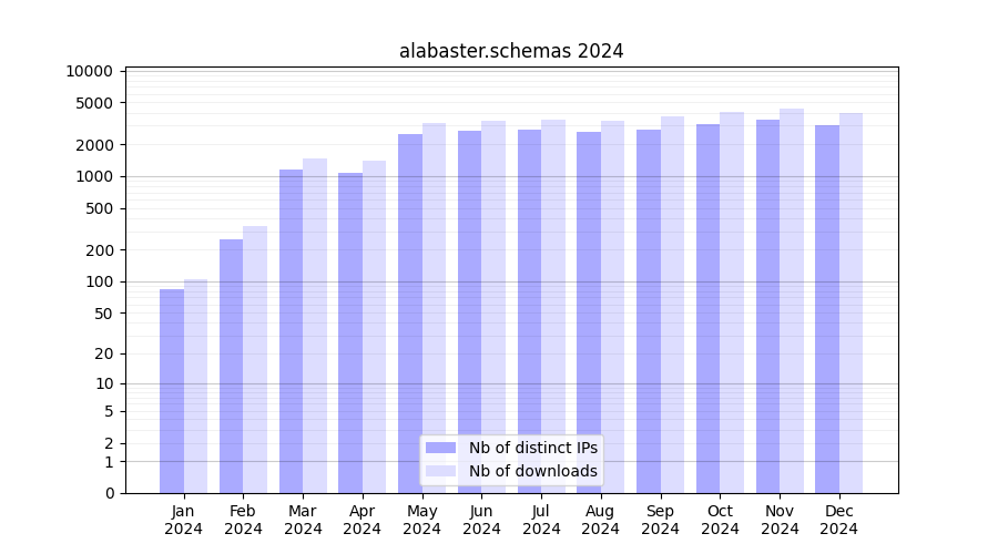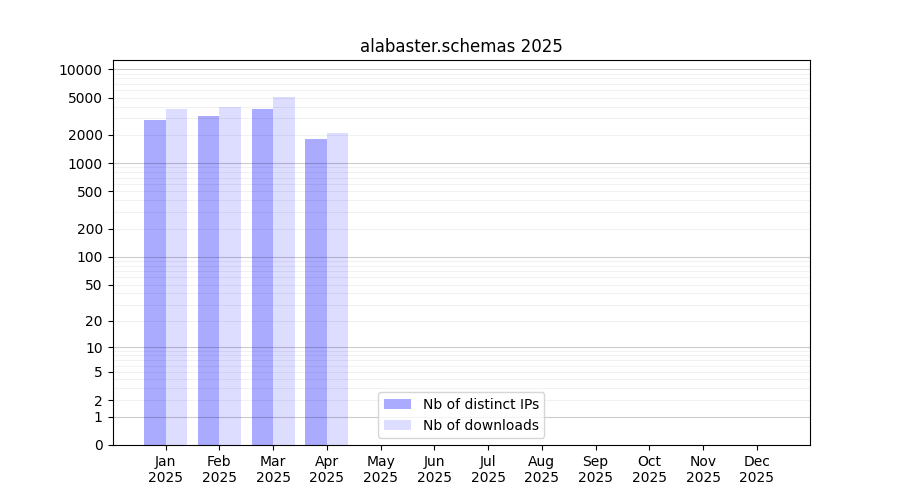 Number of downloads for software package alabaster.schemas, year by year, from 2025 back to 2014 (years with no downloads are omitted):